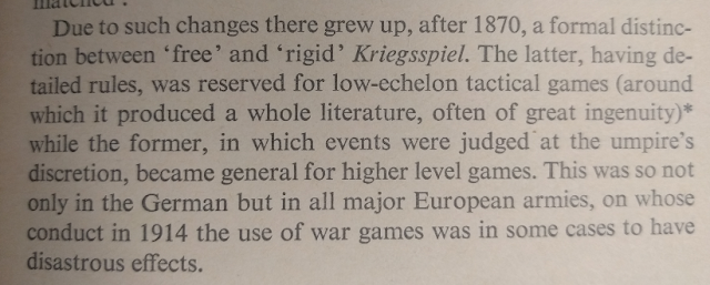 Tout d’abord, Wilhelm Jakob Meckel proposa 1) de libérer l’Umpire [arbitre du jeu de guerre] de certaines règles et 2) de le laisser décider seul en ne gardant que les dés et les tables des pertes. Il publia cette innovation dans un livret Studien über das Kriegsspiel [Étude du jeu de guerre] en 1873.